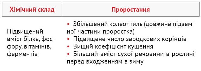 Зокрема встановили, що одна крупніша насінина містить більше білка, фосфору, вітамінів і ферментів, тому вона інтенсивніше проростає.