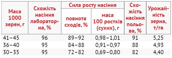 Таблиця 2. Вплив крупності (маси 1000 зерен) на посівні якості і врожайні властивості насіння пшениці озимої
