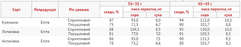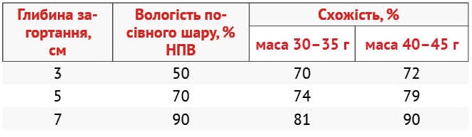 Вплив крупності особливо проявляється за різної глибині загортання насіння (табл. 3). За більшої глибини краще проростає крупне насіння, позаяк воно перебуває у вологому шарі ґрунту і формує довший колеоптиль (підземну частину ростка).