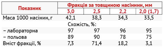 Проте аналіз показує, що фракції, отримані на різних ситах, істотно відрізняються за показниками маси 1000 насінин, лабораторної і польової схожості (табл. 4). Найбільш повноцінним є насіння з сит отворами 3,0 і 2,5 мм, їх вміст становить 7,3 і 71,4% відповідно. Гірша якість (маса, схожість) у фракцій, що містять насіння завтовшки 2,0 (1,7), 2,2 мм. Вміст цих фракцій становить 3,1 і 18,2% відповідно.