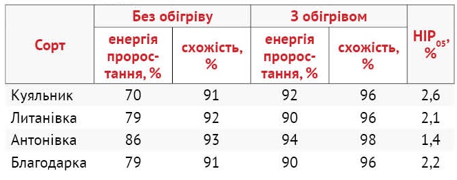Таблиця 6. Вплив повітряно-теплового обігріву на проростання насіння пшениці озимої (врожай 2011–2012 рр.)