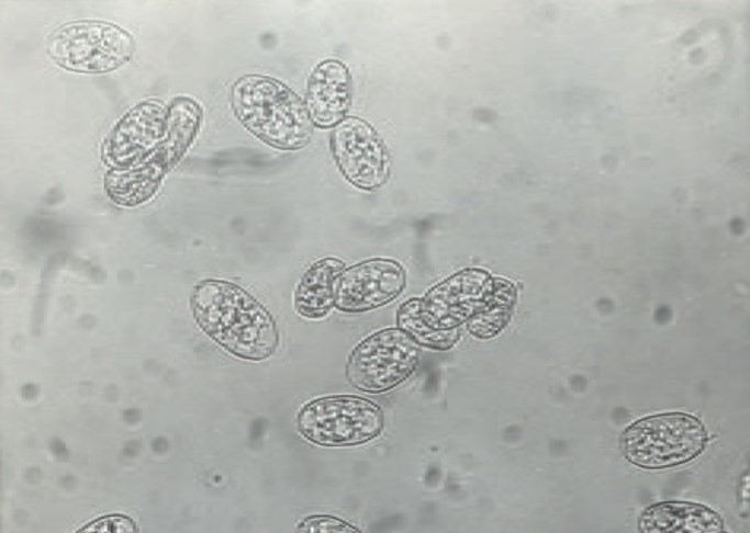 Конідії — це нестатеві спори, які утворюються на спеціальних коротких стеблах конідіофорах. Вони прозорі, розміром 20–38 × 12 мкм, містять добре видимі під мікроскопом тіла фіброзину, що допомагають визначити збудника. Інфіковані бічні і верхівкові бруньки стають осередками зимівлі конідій і продукують міцелій наступної весни. Уражені тканини мають меншу зимостійкість, тому інфіковані бруньки разом із збудником вимерзають.