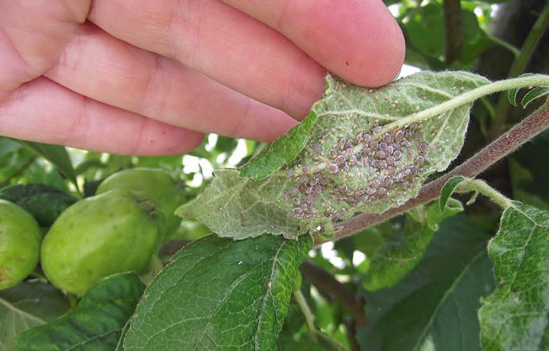 Колонії сірої яблуневої попелиці зісподу листка яблуні