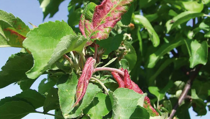 Зміна кольору листків яблуні через живлення кров’яної попелиці