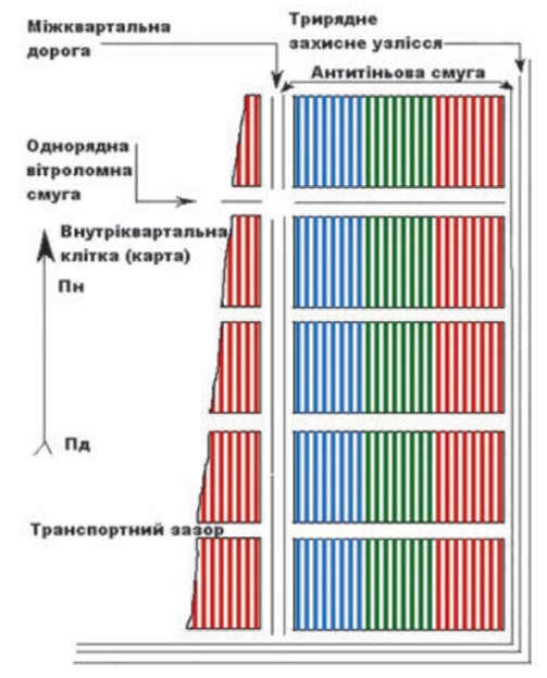 Тіньові смуги уздовж довгих сторін кварталу від проекції крони деревних порід до проекції плодового дерева розраховують у межах 5–6 м, а смуги уздовж короткої сторони кварталу — 10–12 м. Останні називають розворотними, тому що на них розвертаються машини під час міжрядного обробітку ґрунту і обприскування саду проти шкідників і хвороб.