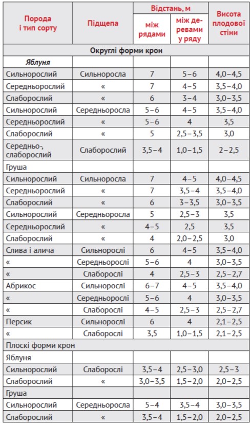 Схеми розміщення плодових дерев у саду залежно від породи, сили росту сортів і підщеп і типу крони