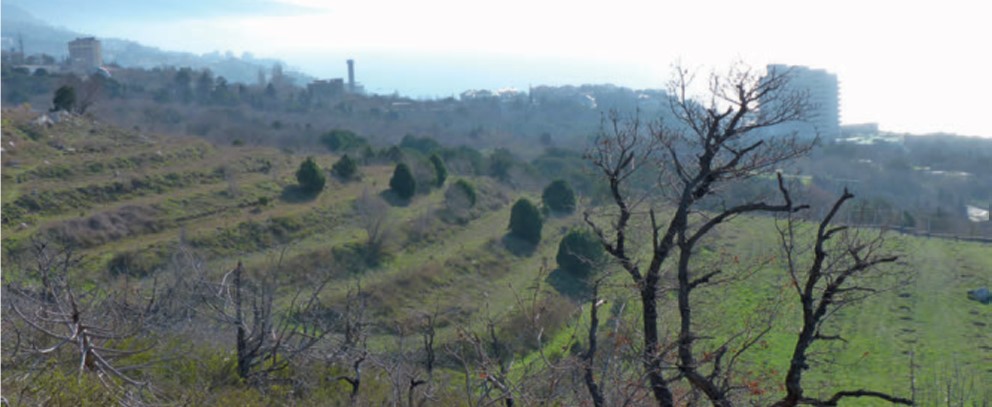 Контурне розміщення дерев використовують на схилах. Дерева висаджують рядами по горизонталях, зважаючи на рельєф місцевості. При цьому відстань у рядах постійна, а між рядами змінюється залежно від рельєфу. Контурна система садіння доцільна лише на схилах 5–10°, а також на терасах.