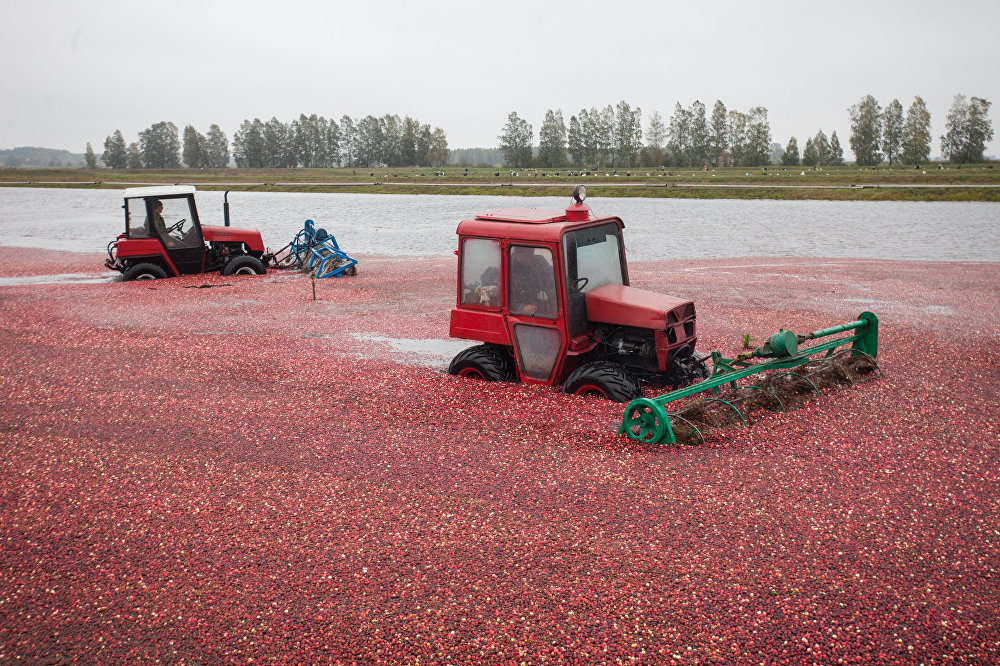 Так на початку осені чеки з журавлиною заливають водою на 40-50 см. Потім у поле виходять трактори обладнані спеціальними граблями, які вичісують ягоди - журавлина спливає на поверхню і залишаються там до закінчення збору урожаю. Після цього її стягують до берега спеціальними волоками і транспортерами подають на причепи.