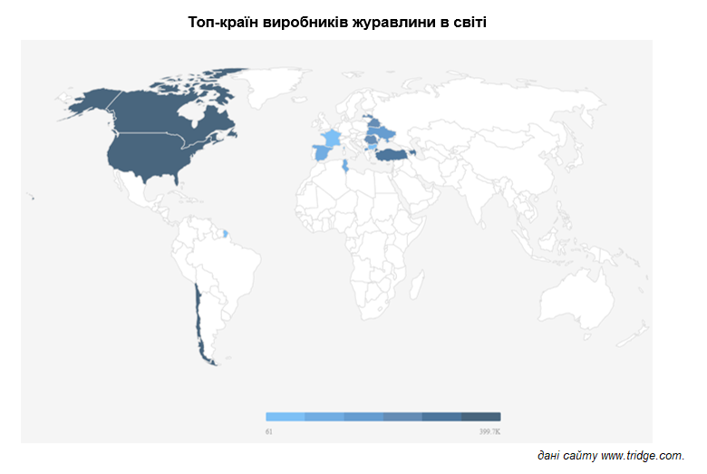 Сьогодні три країни роблять погоду у цій сфері. Так на США, Канаду та Чилі вирощують понад 90% ягід, що потрапляють на ринок. Лише США експортує понад 60% журавлини.