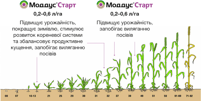 На пізніх термінах сівби восени та на посівах, де навесні спостерігається строкатість, зрідженість і на період весняного рівнодення (20–21 березня) ще не досягнуто оптимальної фази розвитку озимої пшениці й озимого ячменю (кущення), варто вносити Моддус® Старт у нормі 0,2–0,3 л/га у фазу розвитку культури ВВСН 13–22 (три листки — початок кущення). Це допоможе збільшити продуктивне кущення і стеблостій, покращити розвиток кореневої системи, вирівняти розвиток рослин. Проти вилягання оптимальною для застосування є фаза кінець кущення — початок виходу в трубку (ВВСН 29–31). Норма внесення для озимої пшениці та ячменю — 0,3–0,6 л/га. Для скорочення підколосового міжвузля і загального габітусу варто провести повторну обробку у фазу прапорцевого-підпрапорцевого листка (ВВСН 37–39) у нормі 0,2–0,3 л/га.