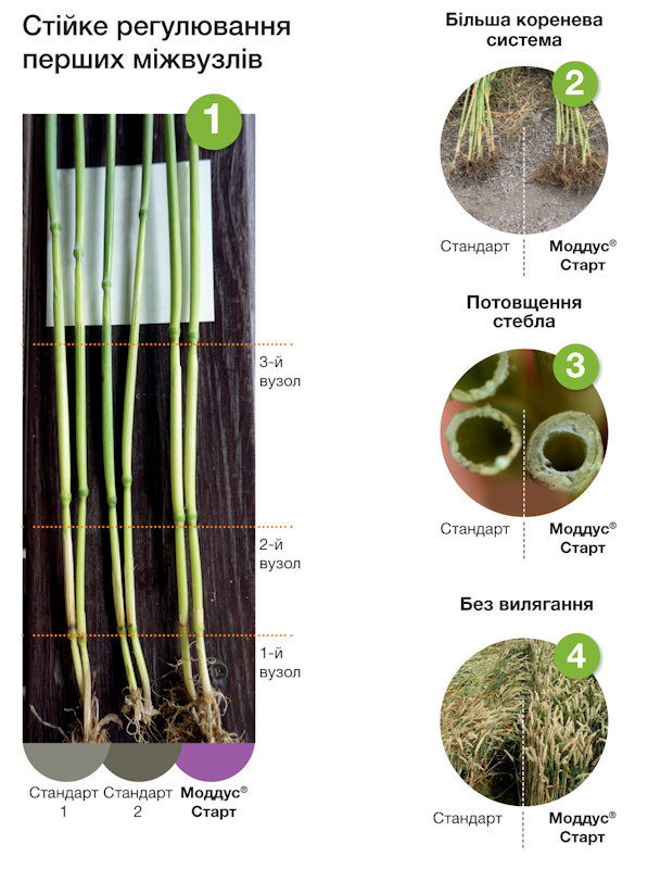 Моддус® Старт значно впливає на довжину і масу коренів. Під час досліджень (польових, тепличних і лабораторних) було встановлено, що для збільшення обсягу, довжини та маси коренів норма використання Моддус® Старт повинна становити у зернових колосових культур 0,1–0,3 л/га. Помічено збільшення довжини коріння на 10–40%, а обсяг і кількість мікрокоренів також збільшувалися на 10–30%. У всіх дослідженнях спостерігався позитивний вплив Моддус® Старт на ріст і розвиток кореневої системи проти контролю (без ретарданта). Перевагою у збільшенні кореневої системи є підвищення ефективності використання азоту, фосфору, калію та води (вологи), а також стресостійкості. Дослідження, які проводять по всьому світі, зокрема в Україні, демонструють відмінну ефективність щодо зменшення висоти рослин, продуктивне кущення та позитивний вплив на збереження (збільшення) врожайності зернових культур, що і можна спостерігати на графіках та фото, які подано нижче.