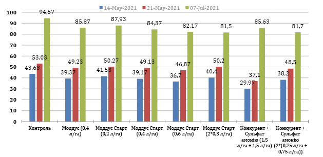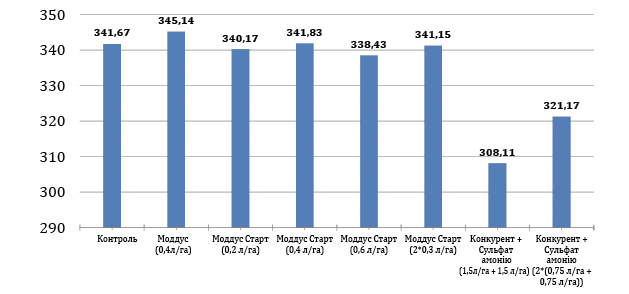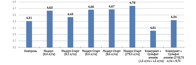 • як видно із графіка 2, за застосування у фазу ВВСН 31 Моддус® та Моддус® Старт не мають негативного впливу на продуктивний стеблостій, проте на ділянках, де було застосовано конкурентний продукт, падіння (зменшення) продуктивного стеблостою спостерігалось на рівні 5–12% до контрольної (необробленої) ділянки;