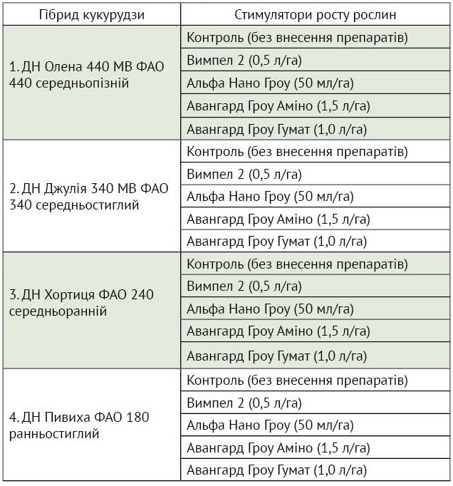 Для сівби брали вітчизняні гібриди Державної установи Інститут зернових культур НААН різних груп стиглості, а саме: ДН Пивиха ФАО 180 ранньостиглий, ДН Хортиця ФАО 240 середньоранній, ДН Джулія 340 МВ ФАО 340 середньостиглий, ДН Олена 440 МВ ФАО 440 середньопізній. На посівах зазначених гібридів двічі у фазу 3–5 листків та 10–12 листків проводили внесення таких стимуляторів росту рослин: Вимпел 2 (0,5 л/га), Альфа Нано Гроу (50 мл/га), Авангард Гроу Аміно (1,5 л/га), Авангард Гроу Гумат (1,0 л/га). Був також варіант без унесення препаратів (контроль). Дослід двофакторний, розміщення ділянок першого та другого порядків послідовне: 1–2–3–4. Повторність триразова. Схему досліду наведено в табл.