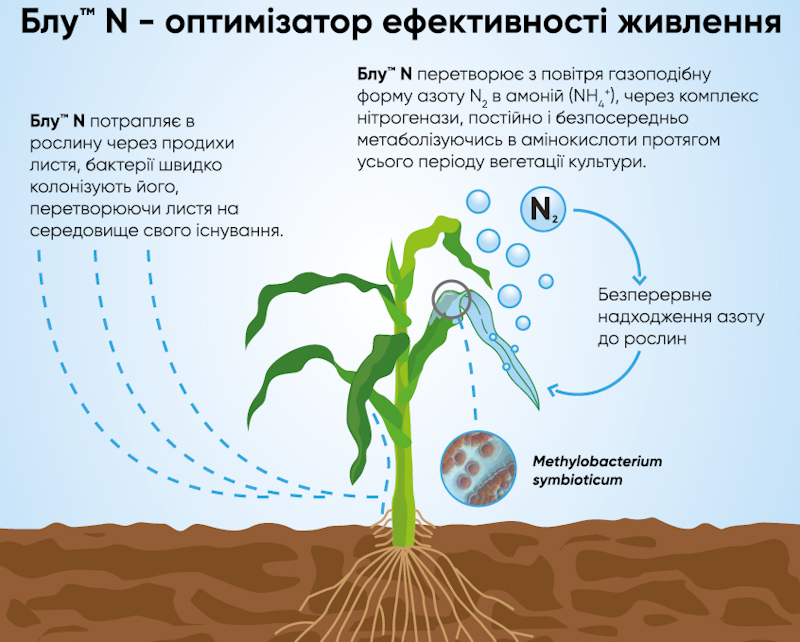 БлуТМ N — інноваційний біопродукт, що містить ексклюзивний штам бактерій Methylobacterium symbioticum, діяльність яких сприяє фіксації рослинами додаткового азоту з атмосфери(N2), що позитивно впливає на їх ріст і розвиток.
