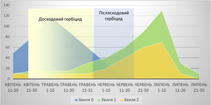 Якщо ситуація погодних умов 2017 року повториться, страхові гербіциди, внесення яких «прив’язують» до фази розвитку культури, знищуватимуть лише другу хвилю бур’янів і лише на 40%, не досягнувши її піку (появи конкурентних рослин). Решта інтенсивності другої хвилі може проявитися пізніше залежно від погодних умов.