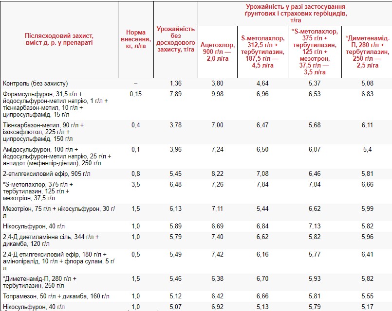 • 7,84 т/га — S-метолахлор, 312,5 г/л + тербутилазин, 187,5 г/л — 4,5 л/га та S-метолахлор, 375 г/л + тербутилазин, 125 г/л + мезотріон, 37,5 г/л в нормі 3,5 л/га — за післясходового застосування.