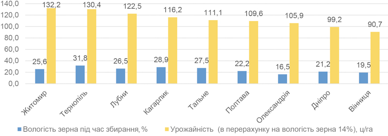Урожайність (ц/га) та вологість зерна при збиранні (%) гібрида кукурудзи Спектрал за класичної технології вирощування в різних ґрунтово-кліматичних умовах України, 2023 р.