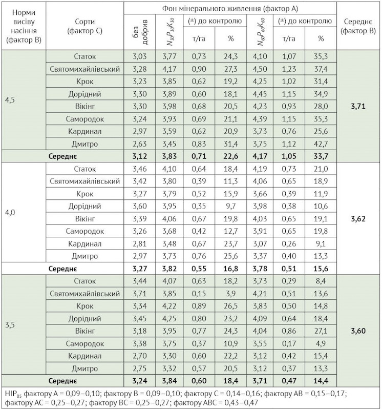 Сорт Крок у середньому за роки досліджень вищий рівень урожаю формував за норми висіву насіння 4,0 млн схож. насінин/га, і вона становила 5,38 т/га. Голозерний сорт Кардинал вищу врожайність 4,24 т/га забезпечував за норми висіву насіння 4,0 млн схож. насінин/га, а Дмитро — за норми висіву насіння 4,5 млн схож. насінин/га, і вона становила 4,40 т/га.