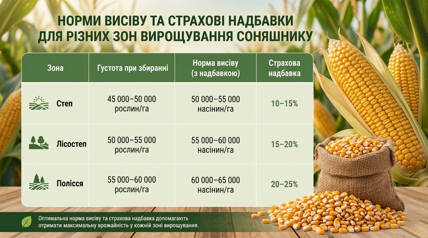 Страхова надбавка на Поліссі вища (20–25%) бо польова схожість на важких і вологих ґрунтах нижча. Поліська весна холодніша — насіння довше лежить у ґрунті й більший відсоток не сходить. Степ і Південь — навпаки, нижча надбавка, бо ґрунт тепліший і схожість вища.